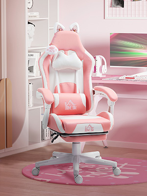Keep comfortable and focused on the game: do it with this HOMCOM cute gaming chair with footrest. It’s decorated with cute and playful cat ears and paw for a touch of whimsy. Sink into the computer desk chair with medium-density foam padding wrapped in easy-to-clean faux leather. Adjust the seat height to game at the right position. Enjoy the freedom to recline up to 135° while the retractable footrest and linked armrests of the PC gaming chair offer total comfort during long gaming sessions.