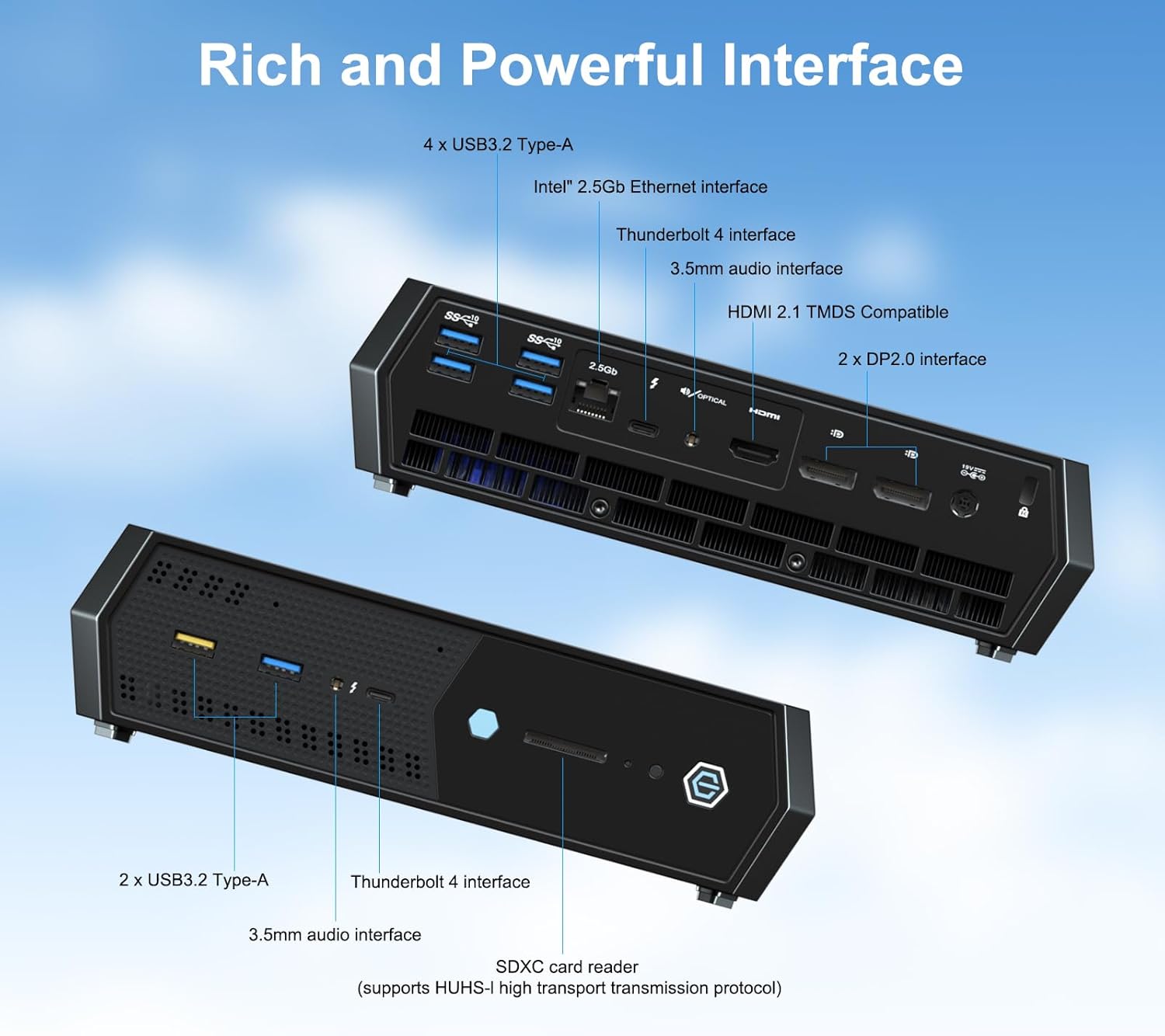 [A Small Gaming PC with Feature-Rich Ports] 2 x Thunderbolt 4 ports, 6 x USB 3.2 ports, 1 x HDMI 2.1 port, 2 x DP2.0 port, 1 x Intel i225-LM RJ45 2500Mbps Ethernet port, 2 x 3.5mm headphone/mic Jack, 1 x SDXC Card Slot