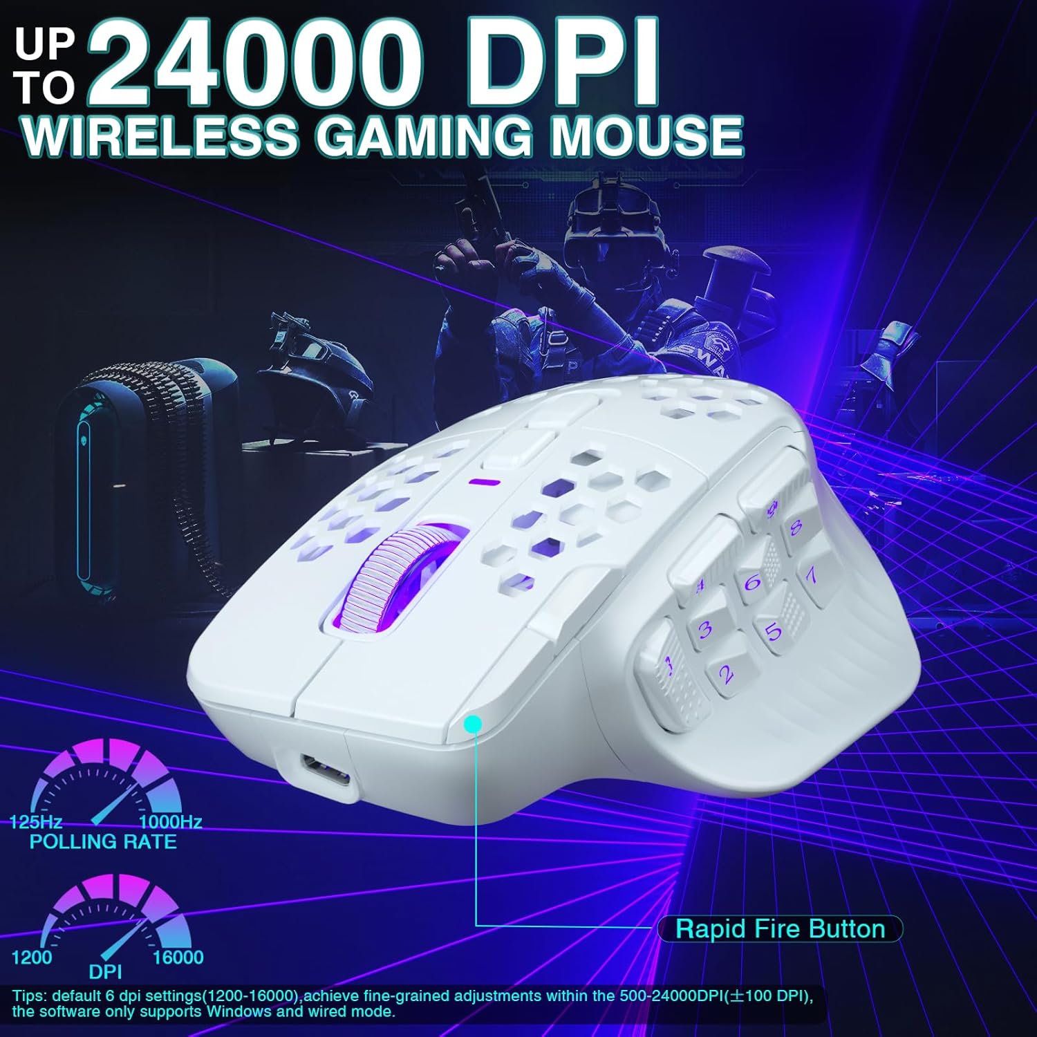 High-Precision Sensor: SM809 Pro wireless gaming mouse with side buttons is equipped with a high performance PAW3311 optical sensor,boasting low latency and exceptional precision.This MMO mouse allows you to fine adjust the DPI from 100 to 24000 (±20%),the polling rate up to 1000Hz,tracking speed 300IPS,acceleration 35G.Whether you’re performing precise maneuvers or making rapid movements,this gaming mouse offers unparalleled accuracy,ensuring that every in game command is flawlessly translated onto the screen