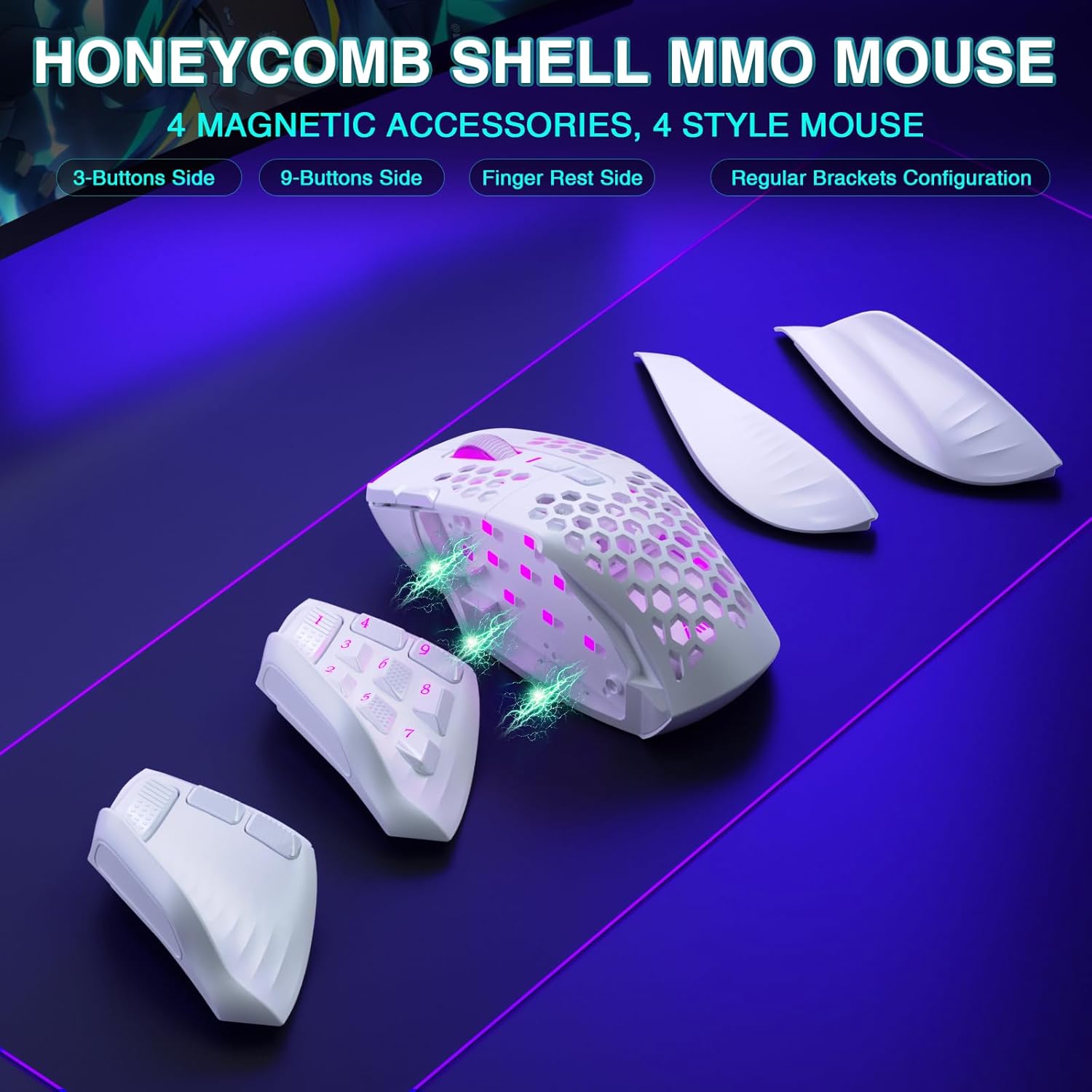 Customization for Personalized Experience:The SM809 Pro MMO mouse comes with 4 interchangeable magnetic side panels(3 buttons side/9 buttons side panel/figure rest side panel/regular side panel). Replacing these accessories is smooth and convenient.Users can replace the mouse accessories according to their own preferences to achieve personalized customization.Through the exclusive software,users can reset button functions,complex macro files,adjust DPI and adjust RGB lighting. The comprehensive programmability and customizability of the macro mouse enable the creation of a fully customized gaming and working environment, making your experience more enriching and interesting.
